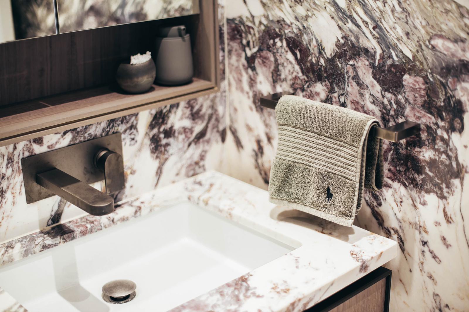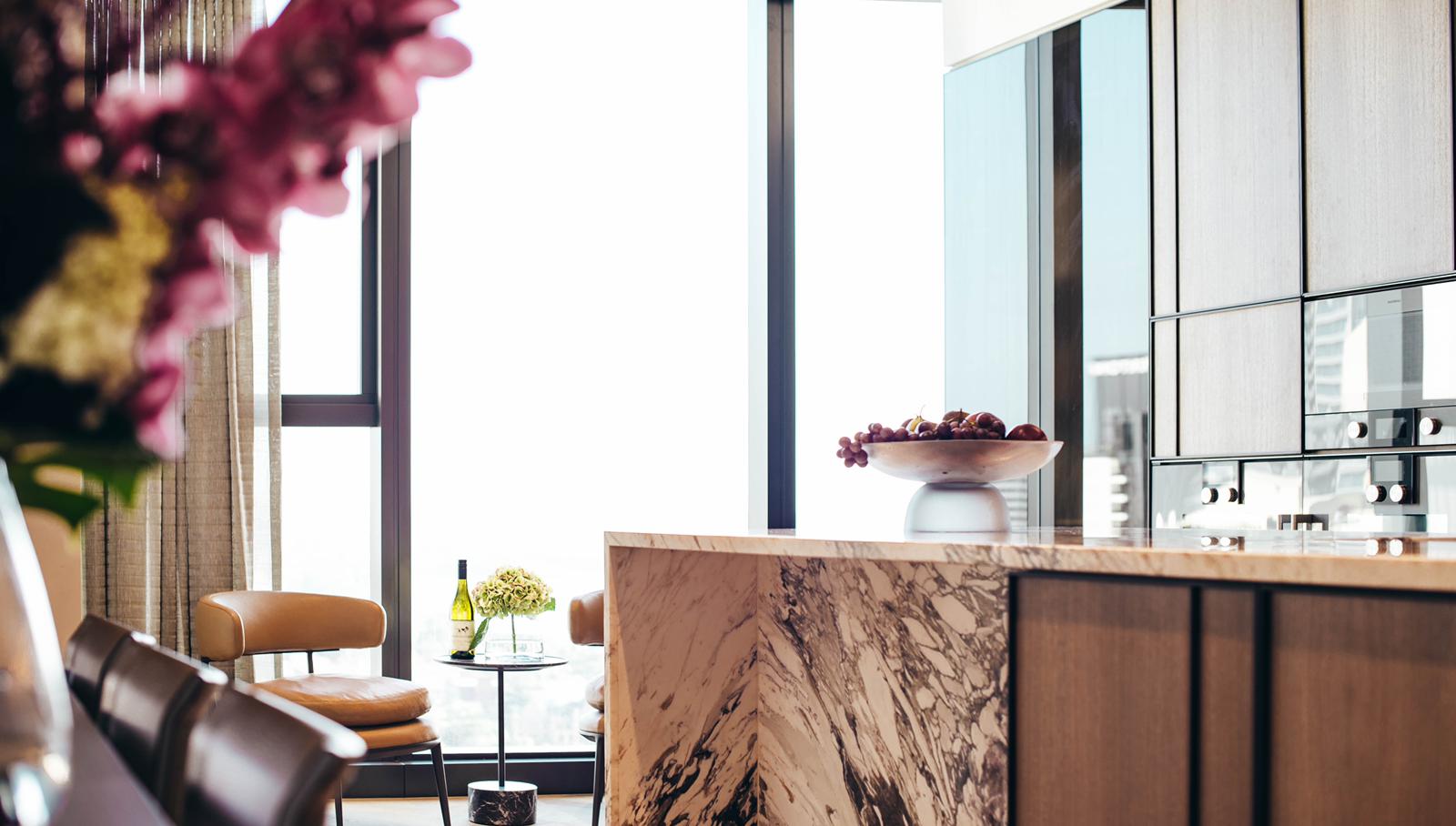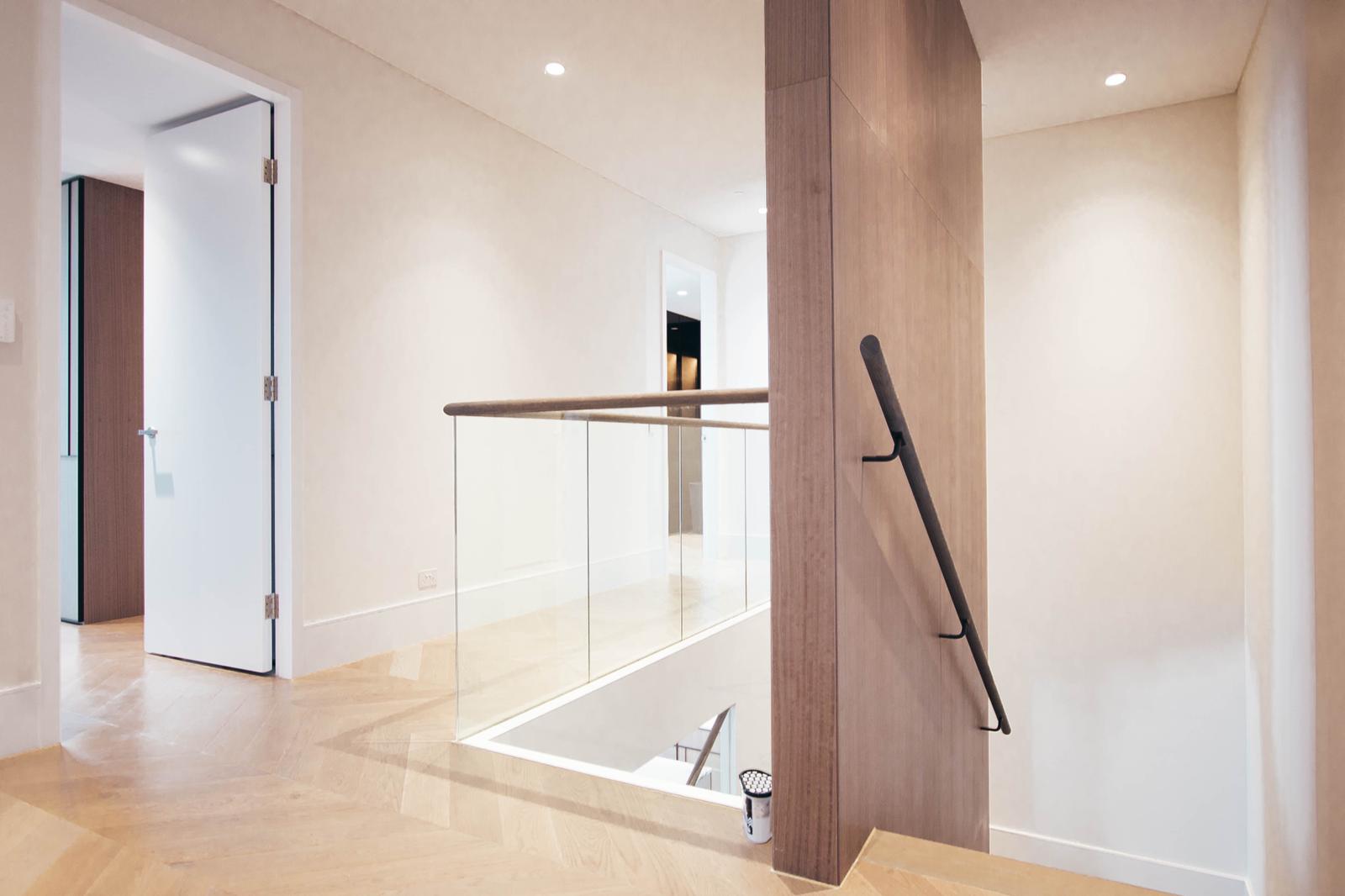 Highlights of the fit-out include premium timber flooring across both levels, exquisite marble and stone accents sourced internationally for all joinery and most walls, a fully integrated CBUS electrical system, and refined granite tiles on the balcony floors.