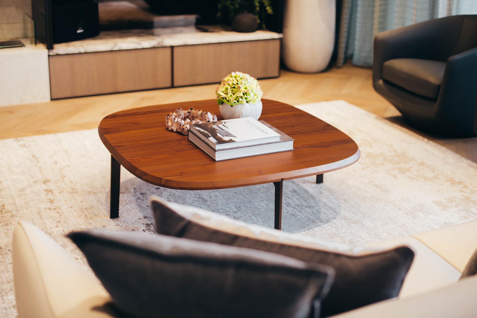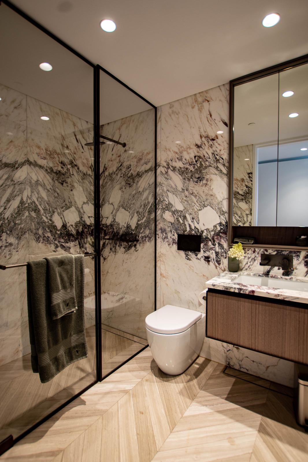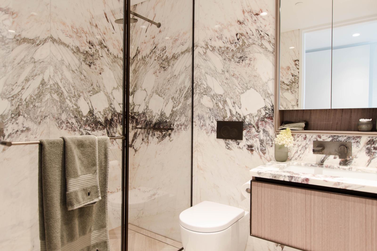 Highlights of the fit-out include premium timber flooring across both levels, exquisite marble and stone accents sourced internationally for all joinery and most walls, a fully integrated CBUS electrical system, and refined granite tiles on the balcony floors.