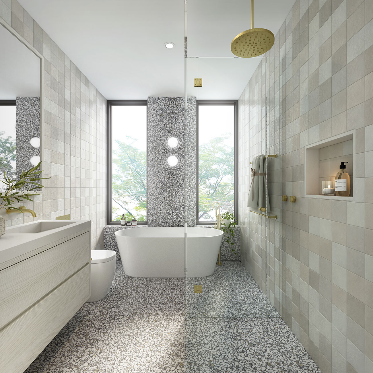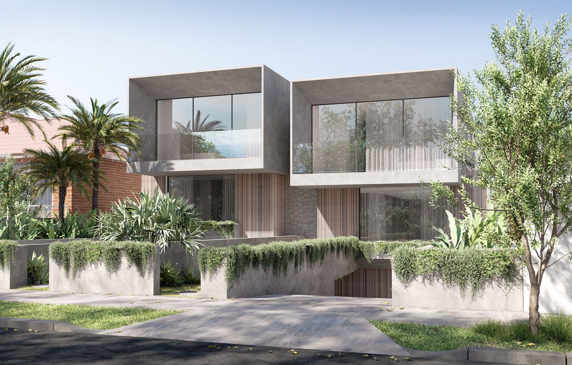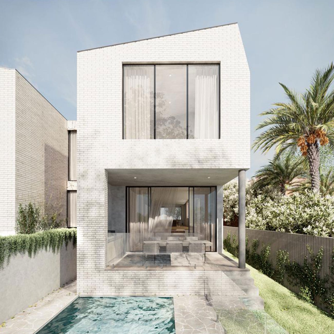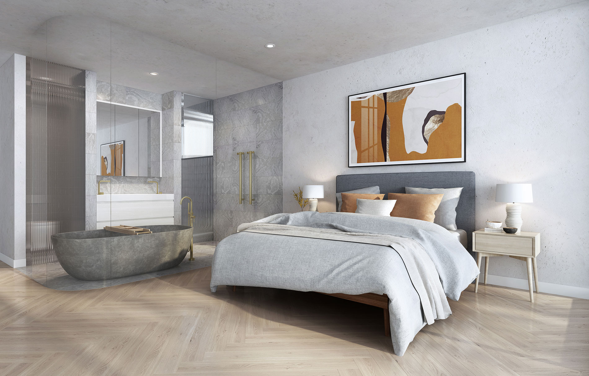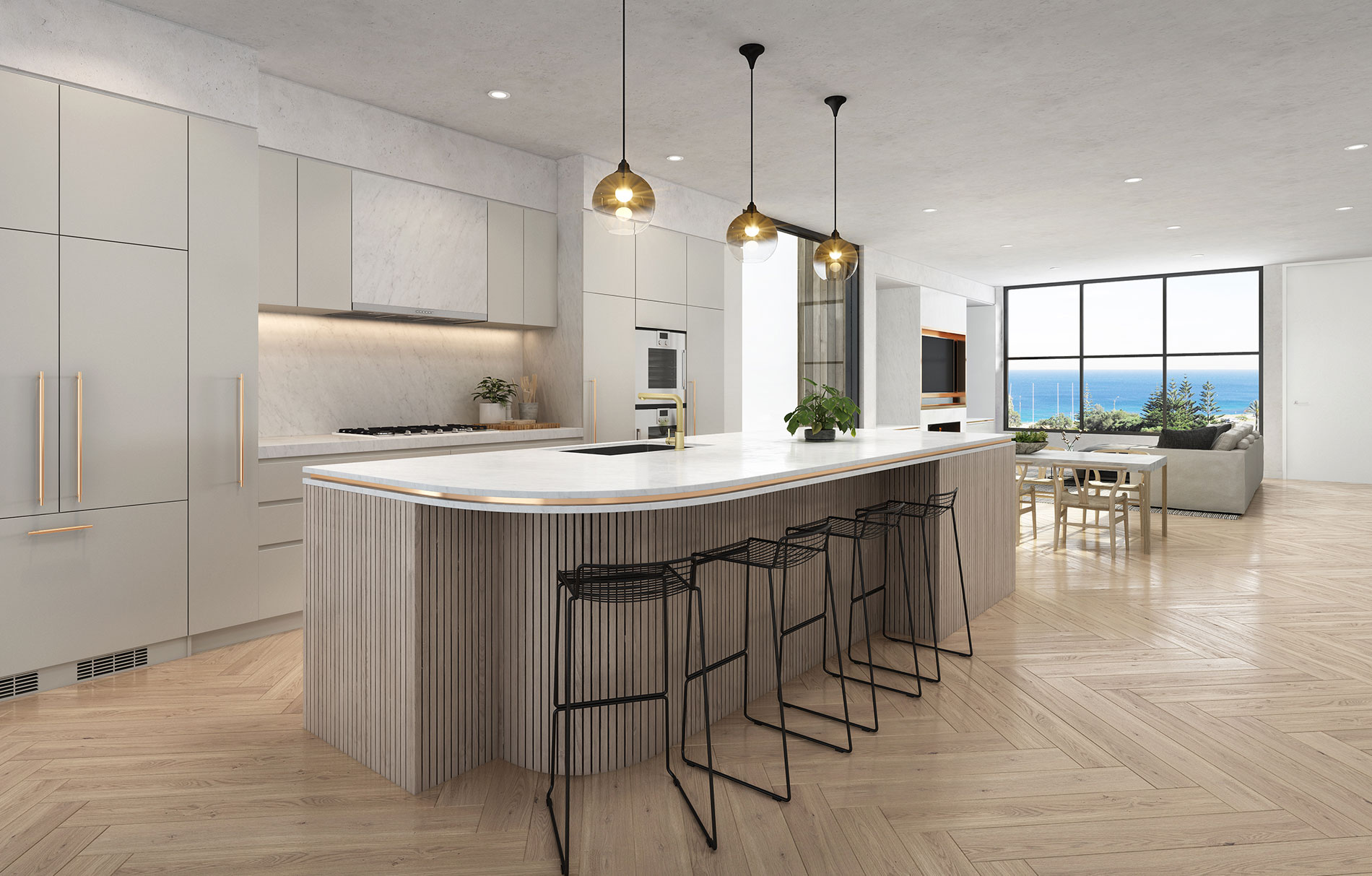 Surfaces of natural limestone, aged oak timbers, sand-washed walls and Arabescato marble feature in the stunning Mia Lake curated interiors, with this robust full brick and concrete design expertly blurring boundaries between open and private spaces.